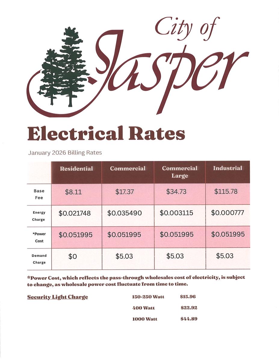 These are both variable costs (costs that vary each month depending on the amount of electricity used) that are based on the amount of electricity (kWh) used by the customer for the month. The energy charge and power cost are multiplied by the kWh used by the customer to come up with a dollar amount to be charged for each of these items. The energy charge represents the non-fuel cost to produce the electricity used (such as the cost of the power lines, for example). In contrast, the power cost is merely a pass through cost for any purchased power and the fuel needed to generate the required electricity used. The power cost is the cost that is charged to Jasper to purchase the power supplied to customers. Along with some other local municipalities, Jasper purchases its power from Sam Rayburn Municipal Power Association (SRMPA). These costs vary each month, based on market forces, and are passed on directly to customers based on their usage share of the power purchased.