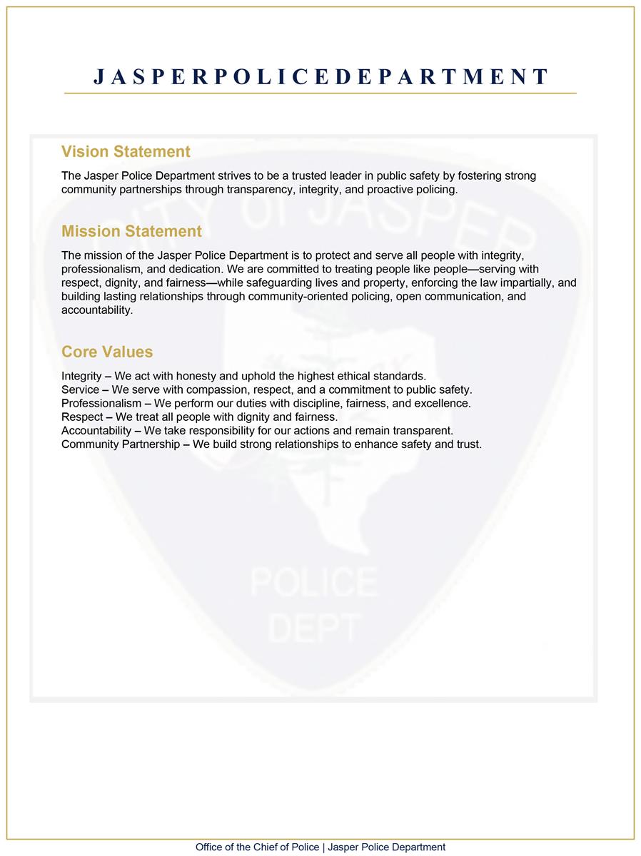The men and women of the Jasper Police Department represent a dedicated and diverse team of professionals committed to upholding the highest standards of public safety and community trust. Our officers work diligently to protect and serve the residents of Jasper with integrity, professionalism, and unwavering dedication.